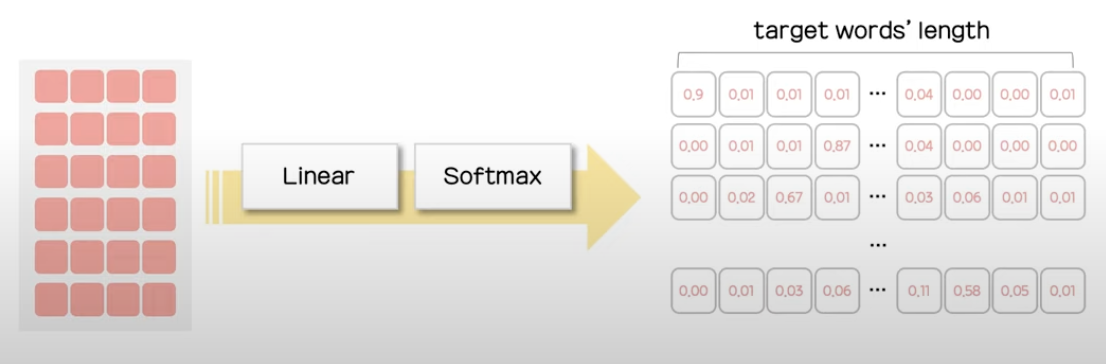 최종 decoder의 output에 linear layer를 추가하고 softmax를 통해 target word 전체의 길이만큼 다음 단어에 등장할 sequence 토큰의 등장 확률을 반환하게 된다.
