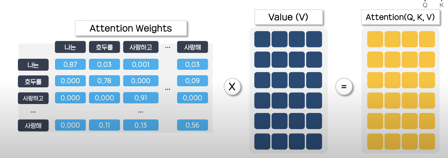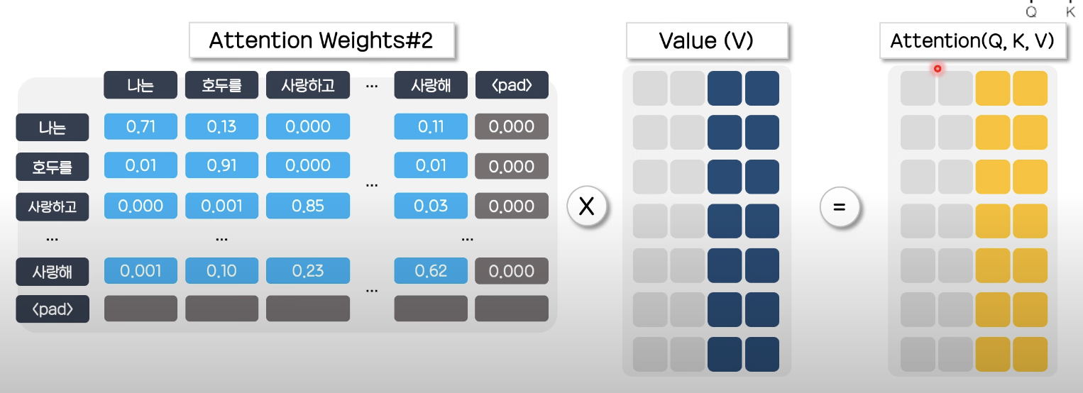 이후 이 유사도를 가중치로한 key와의 가중치 합 a1*[0.1, 0.5] + a2*[-0.1, 0.7] + .... 을 구하는데 이는 query와 관련이 깊은 key의 value 위주로 값을 가져오게 된다.