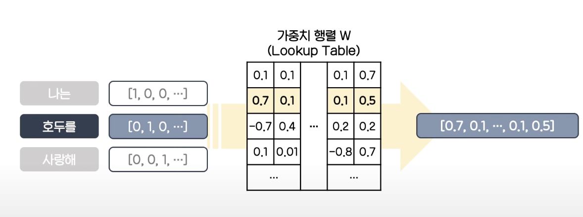 그리고 trainable parameter인 임베딩 행렬 W에서 look-up을 수행해 해당하는 벡터를 그대로 반환한다.