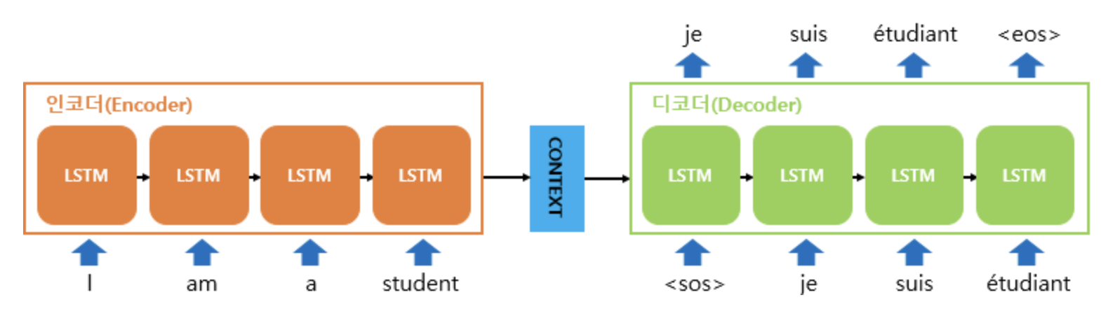 인코더는 입력문장의 모든 단어들을 순차적으로 입력받은 뒤에 마지막에 모든 단어 정보들은 압축해 하나의 context vector를 만들게 된다. 좀 더 정확히 말하면 인코더 LSTM의 마지막 hidden state이다.