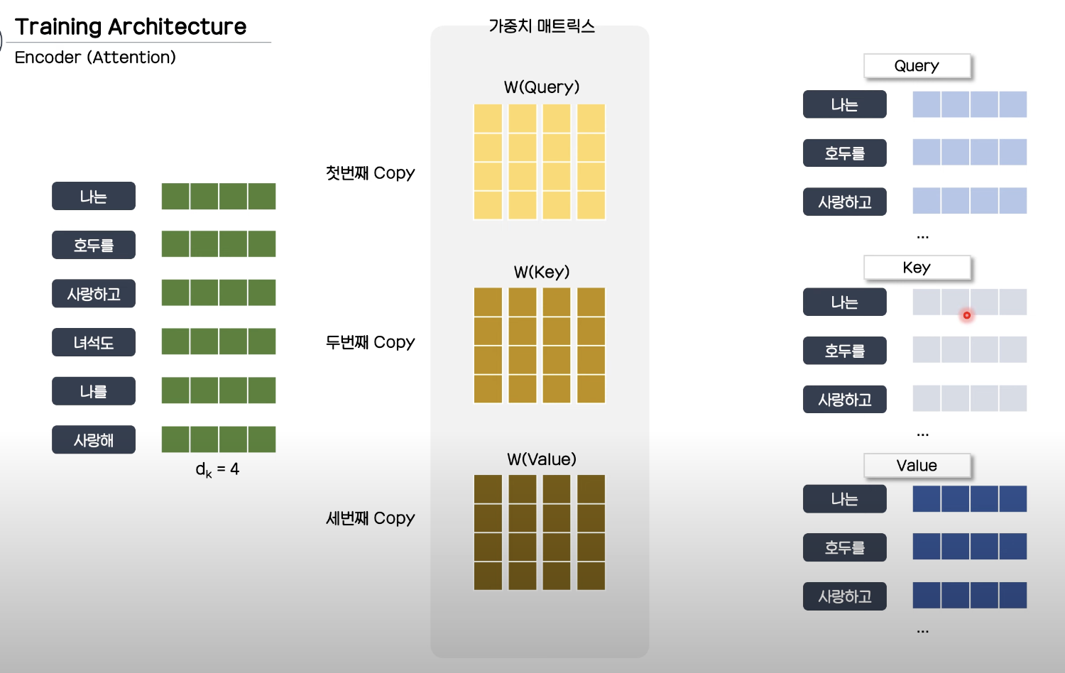 위와 같은 6개의 token input과 4개의 input dk가 설정되었을 때 해당 embedding layer를 총 3개 copy한다.