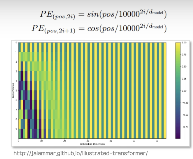 아래 수식과 같은 주기함수 sin, cos 함수를 통해 positional embedding을 수행한다.