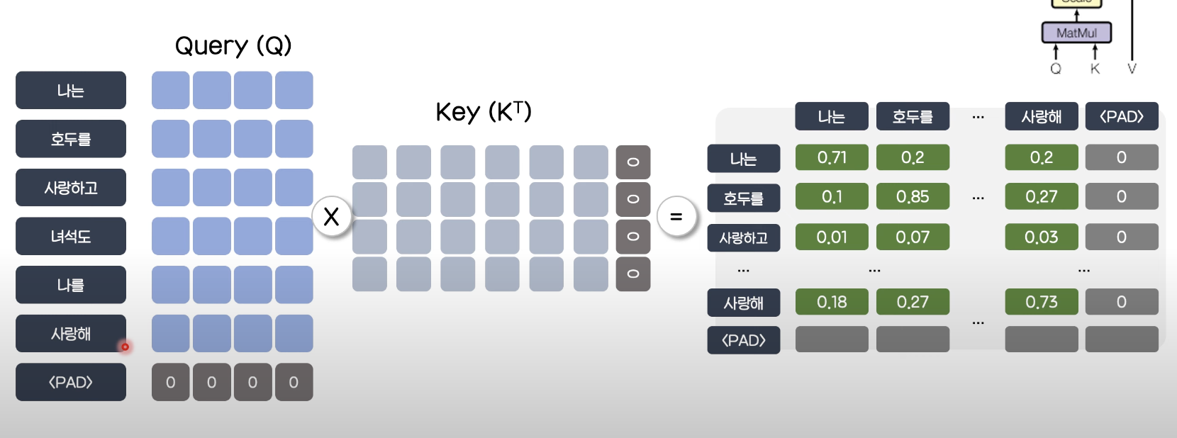 Query와 Key의 내적 연산을 수행하고 dk로 scaling하게 된다. (논문 dk = 512)