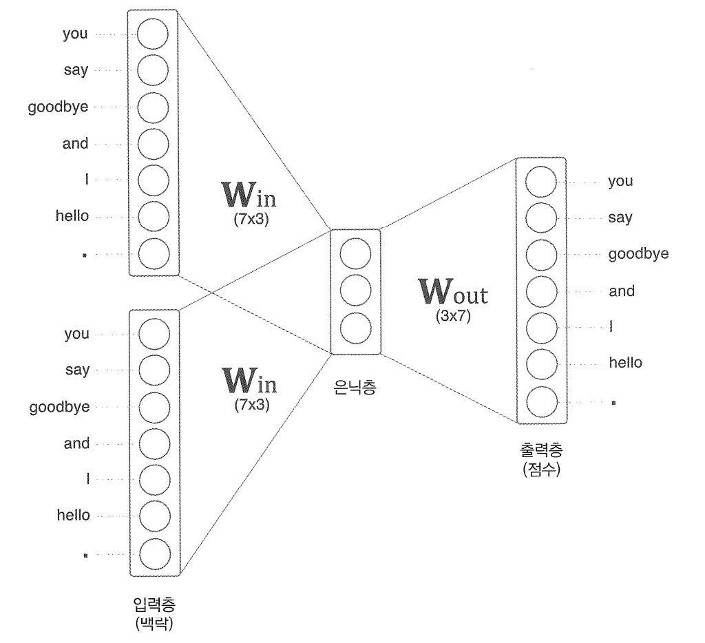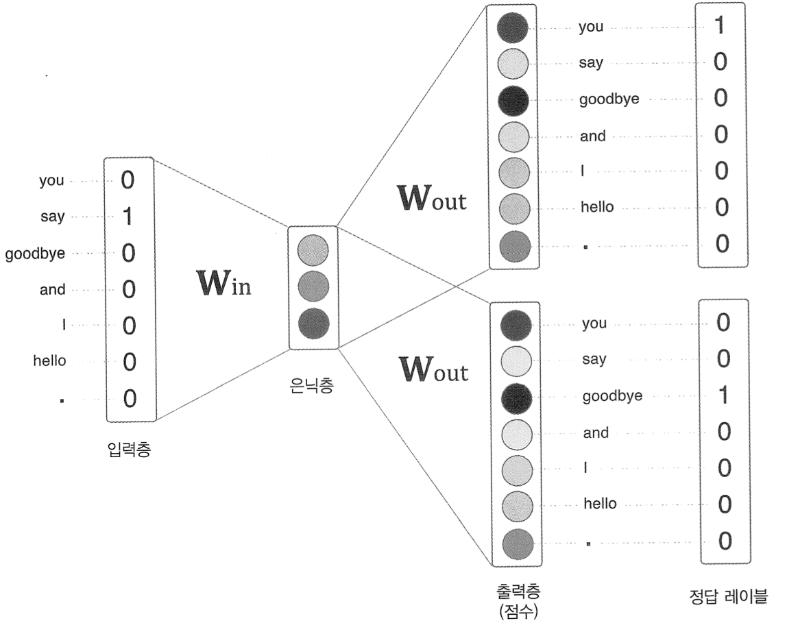 위의 예제의 경우 맥락으로 고려할 단어를 2개로 설정한 경우로, 맥락에 포함시킬 단어가 n개이면 그 입력층도 n개가 된다.