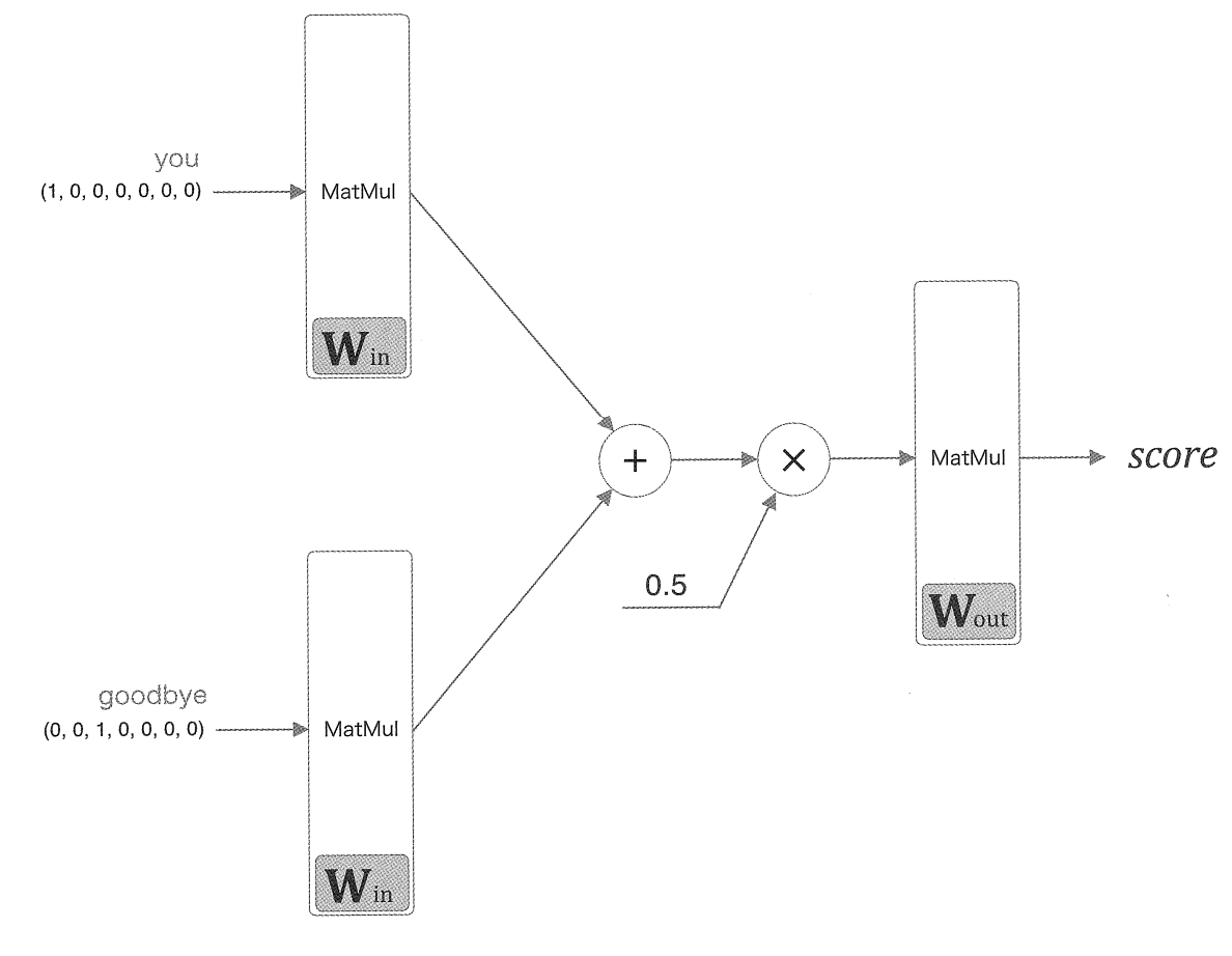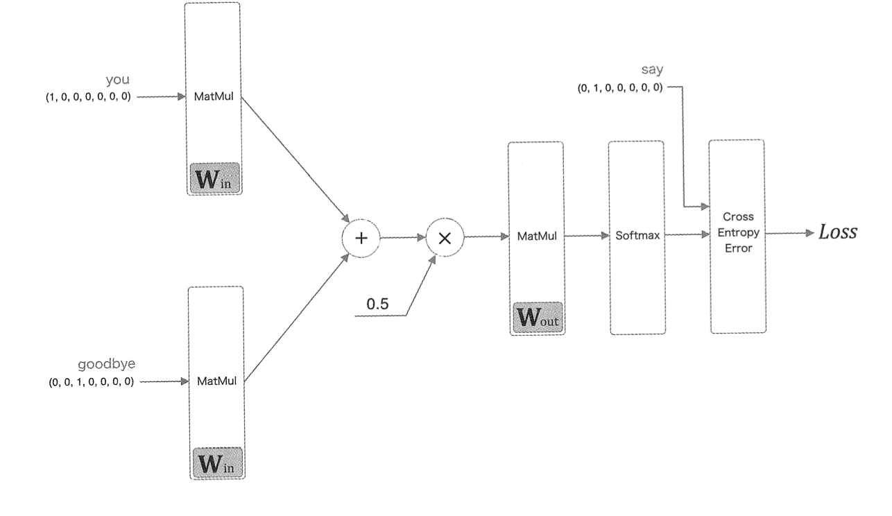 say라는 타겟을 기준으로 window size=1로 설정해 앞 뒤로 한개씩의 단어, 즉 you와 goodbye를 맥락으로 할 경우 CBOW 모델 신경망 구성은 다음과 같다.