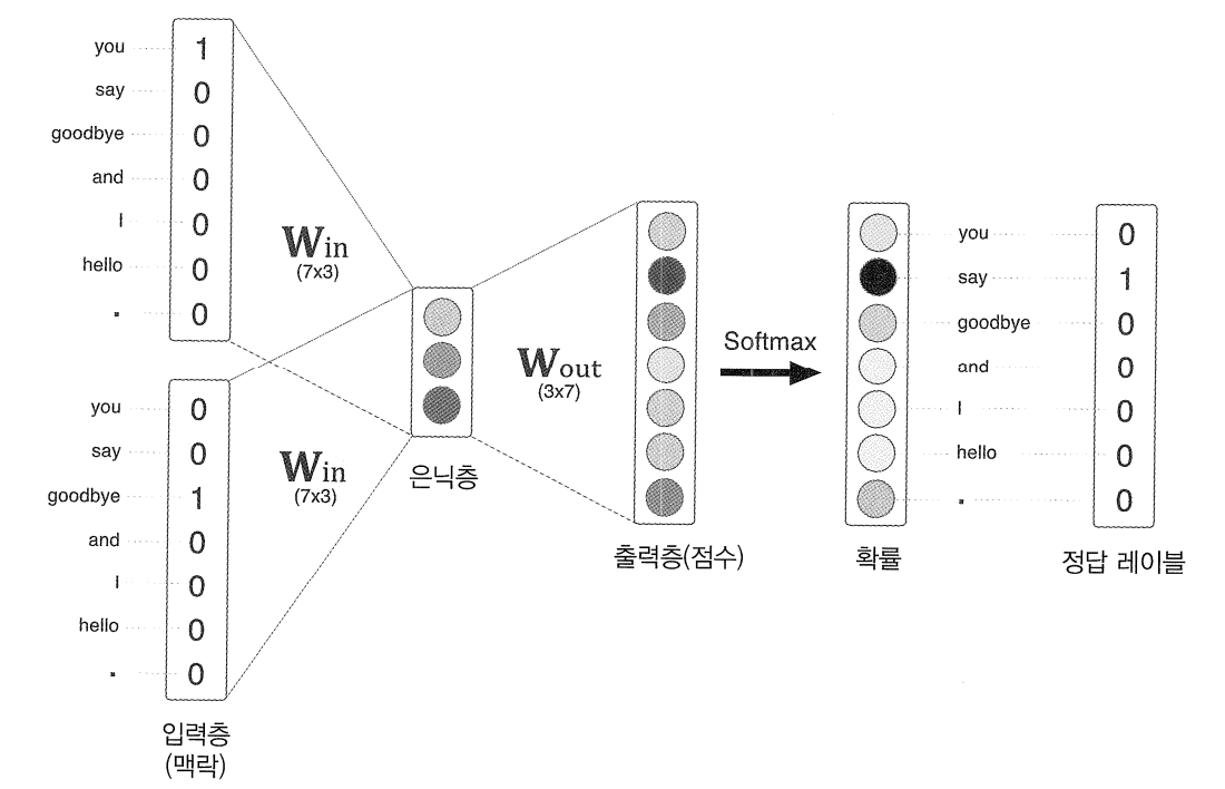 출력층의 뉴런의 갯수는 총 7개인데, 이 뉴런 하나하나가 각각의 단어에 대응된다. 그리고 이는 각 단어의 score를 의미하고 이 값이 높을수록 대응 단어의 출현 확률이 높다는 것을 의미한다. score은 확률로 해석되기 이전의 값이고 이 score에 softmax를 태워야 확률로 해석할 수 있다.