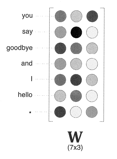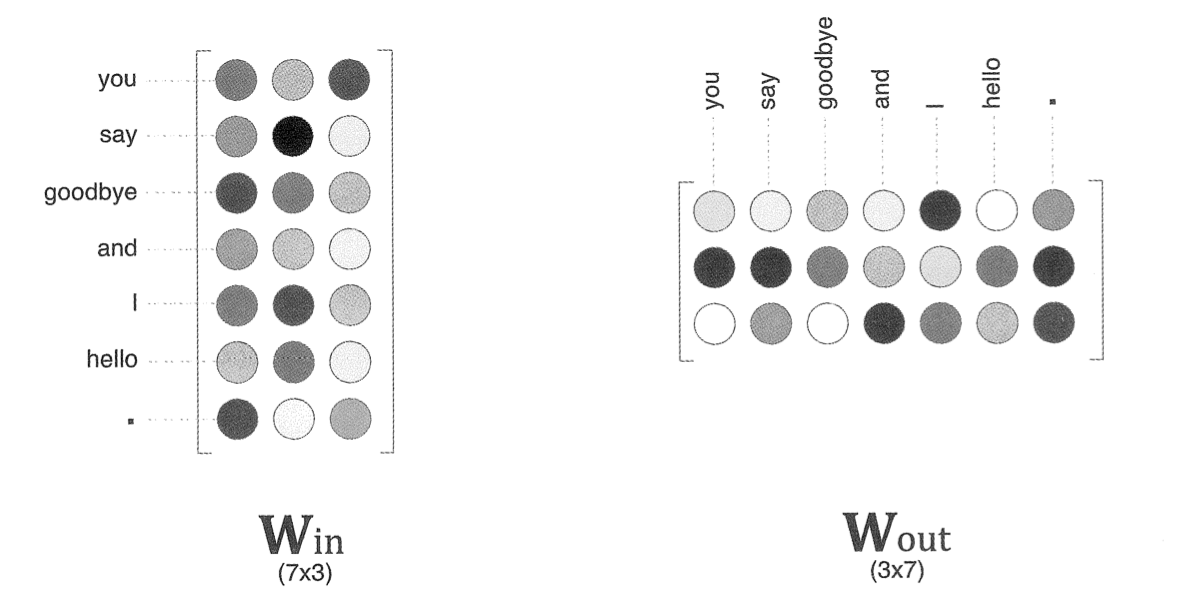 즉, 각 행에는 해당 단어의 분산 표현이 담겨있다고 볼 수 있다. 학습을 진행해 맥락에서 출현하는 단어를 잘 추측할 수 있도록 이 가중치는 업데이트되게 된다.