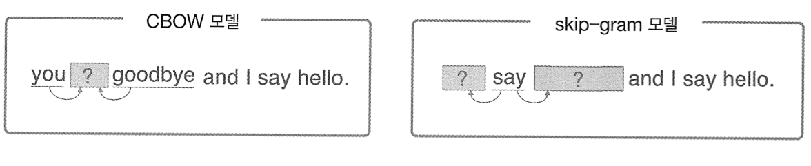 - CBOW : 주변에 있는 단어들을 입력으로 중간에 있는 단어들을 예측하는 방법